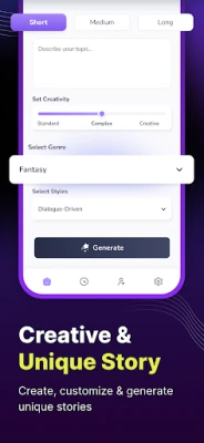 Att skapa din nästa historia är intuitivt och snabbt. Du börjar med att formulera ett ämne, ett ord eller en fras i inmatningsfältet, vilket fungerar som grunden för berättelsen du vill generera. Därefter finjusterar du appens inställningar, där du kan bestämma berättelsens omfattning (kort, medel, lång) samt dess kreativitetsnivå. Med ett enkelt klick på "Generera" tar vår AI-motor över, och kort därefter presenteras ett skräddarsytt verk. AI Story Generator App anpassar sig efter din unika stil och vision, vilket säkerställer att resultatet verkligen återspeglar din smak genom att låta dig justera genrer och intriger, för en djupt personlig berättarupplevelse.
