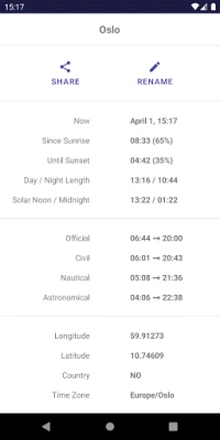Låt solens gång inspirera och optimera din dag. Med denna applikation kan du enkelt planera aktiviteter och maximera din produktivitet genom att veta exakt när mörkret faller. Utöver grundläggande spårning kan du beräkna viktiga tidpunkter som solmiddag, sann midnatt, eller hur lång tid som gått sedan gryningen. Fördjupa din förståelse för dagsljusets nyanser och upptäck skillnaderna mellan officiell, civil, nautisk och astronomisk gryning och skymning – kunskap som kan vara avgörande för allt från fotografering till navigering.