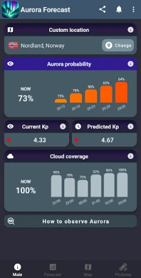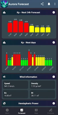 Upplev norrskenets magi som aldrig förr! Oavsett om du drömmer om att se himlens ljusshow för första gången eller är en hängiven entusiast, är denna app din oumbärliga följeslagare. Den förvandlar komplexa rymdväderdata till lättförståeliga insikter, direkt i din hand. Med appen får du en omedelbar överblick över de förhållanden som påverkar norrskenets synlighet, vilket maximerar dina chanser att bevittna dess spektakulära dans på himlen.