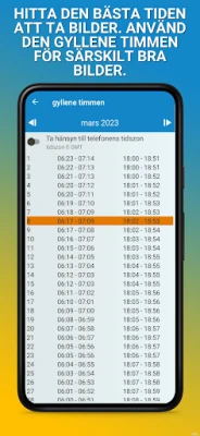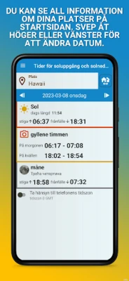 Funktionaliteten sträcker sig även bortom solen, då du också får insikter om månens uppgång och nedgång. Denna information är värdefull för stjärnskådare, fotografer som arbetar med nattbilder, eller vem som helst fascinerad av himlakropparnas rytmer. För att du aldrig ska missa ett magiskt ögonblick kan appen skicka dagliga aviseringar. Ställ in påminnelser för solens uppgång eller nedgång, eller för den gyllene timmen, så att du alltid kan vara redo. Det spelar ingen roll om du planerar en perfekt bild, en avkopplande kvällspromenad, eller bara vill uppleva naturens dagliga skådespel – denna app håller dig informerad och uppdaterad.
