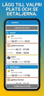 Upptäck exakta tider för soluppgång, solnedgång, månuppgång och månnedgång var du än är. Denna app visar även dagens längd och lyfter fram den gyllene timmen för fotografer, perfekt för fantastiska bilder. Få aviseringar när soluppgången eller solnedgången börjar. Din guide till ljus och skuggor.