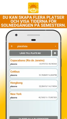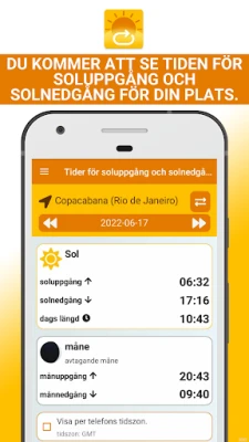 För att ytterligare förenkla din upplevelse kan du ställa in dagliga aviseringar för soluppgång och solnedgång, så du aldrig missar en chans att bevittna himlens skådespel. Spara dina favoritplatser i en överskådlig lista för snabb åtkomst till tiderna du bryr dig mest om, oavsett var du befinner dig i världen. **Sunrise and Sunset-app** är designad för att vara din trogna följeslagare för att upptäcka och njuta av världens mest storslagna ljusshower, direkt i din handflata. Låt dig inspireras och planera dina dagar med himlakropparnas rytm som guide.