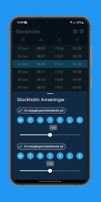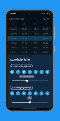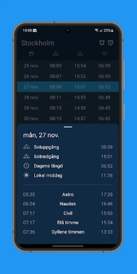För den som älskar att planera, oavsett om det gäller fotografering, friluftsaktiviteter eller bara ren nyfikenhet, erbjuder appen en oslagbar flexibilitet. Sök enkelt efter soltider för vilken plats som helst på jorden, oavsett om det är en framtida semesterdestination eller en plats du minns från det förflutna, tack vare vår intuitiva datumväljare. Utöver de grundläggande tiderna, dyk djupare in i de eftertraktade "gyllene timmarna" och "blåa timmarna" – perfekt för fotografer. Dessutom får du tillgång till detaljerade skymningstider som civil, nautisk och astronomisk skymning, vilket ger en fullständig bild av ljusförhållandena dygnet runt.