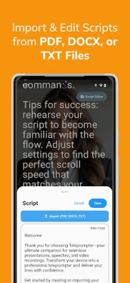 Kärnan i Teleprompters design är dess användarvänlighet och djupa anpassningsmöjligheter. Skriv dina manus direkt i appen med en intuitiv redigerare, eller importera befintliga texter från din enhet på ett ögonblick. För att skapa en optimal läsupplevelse kan du finjustera textstorlek, färg och typsnitt så att det passar dina personliga preferenser och omgivningen. Justera enkelt rullningshastigheten för att perfekt synkronisera med din talrytm, vilket ger dig fullständig kontroll över tempot. För de som använder professionella teleprompter-riggar eller spegelskärmar, erbjuder Teleprompter ett smart spegelläge som inverterar texten.