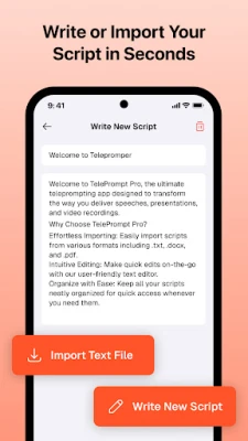Har du någonsin kämpat med att komma ihåg ditt manus under en videoinspelning, vilket resulterar i upprepade tagningar och en mindre flytande presentation? Teleprompter For Video förvandlar din smartphone till en oumbärlig medhjälpare som garanterar felfria videor varje gång. Oavsett om du är en vlogger, företagspresentatör, lärare, innehållsskapare eller offentlig talare, säkerställer appen att du framför ditt budskap med övertygelse och bibehåller en naturlig ögonkontakt med din publik. Aldrig mer kommer du att missa ett ord eller behöva titta bort; texten rullar smidigt precis intill din kameras lins, vilket ger intrycket av att du talar direkt från hjärtat.