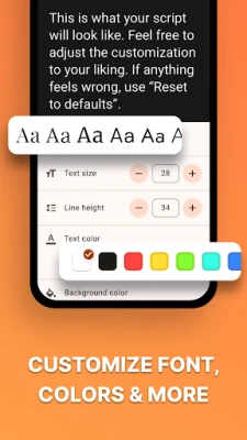 Med Teleprompter blir ditt manus din osynliga medhjälpare. Importera enkelt text från PDF, TXT eller Word-filer och anpassa sedan visningen helt efter dina behov. Välj bland över 20 olika typsnitt, justera förgrunds- och bakgrundsfärger för optimal läsbarhet i alla ljusförhållanden, och använd spegelvändning för att anpassa dig till olika kamerainställningar. Appen stöder även höger-till-vänster-text, vilket garanterar en smidig upplevelse för alla språk. Finjustera rullningshastigheten så att den matchar din talrytm och använd den inbyggda nedräkningstimern för att komma i position innan inspelningen börjar. Med justerbara marginaler blir manuset perfekt inpassat i din videobild.